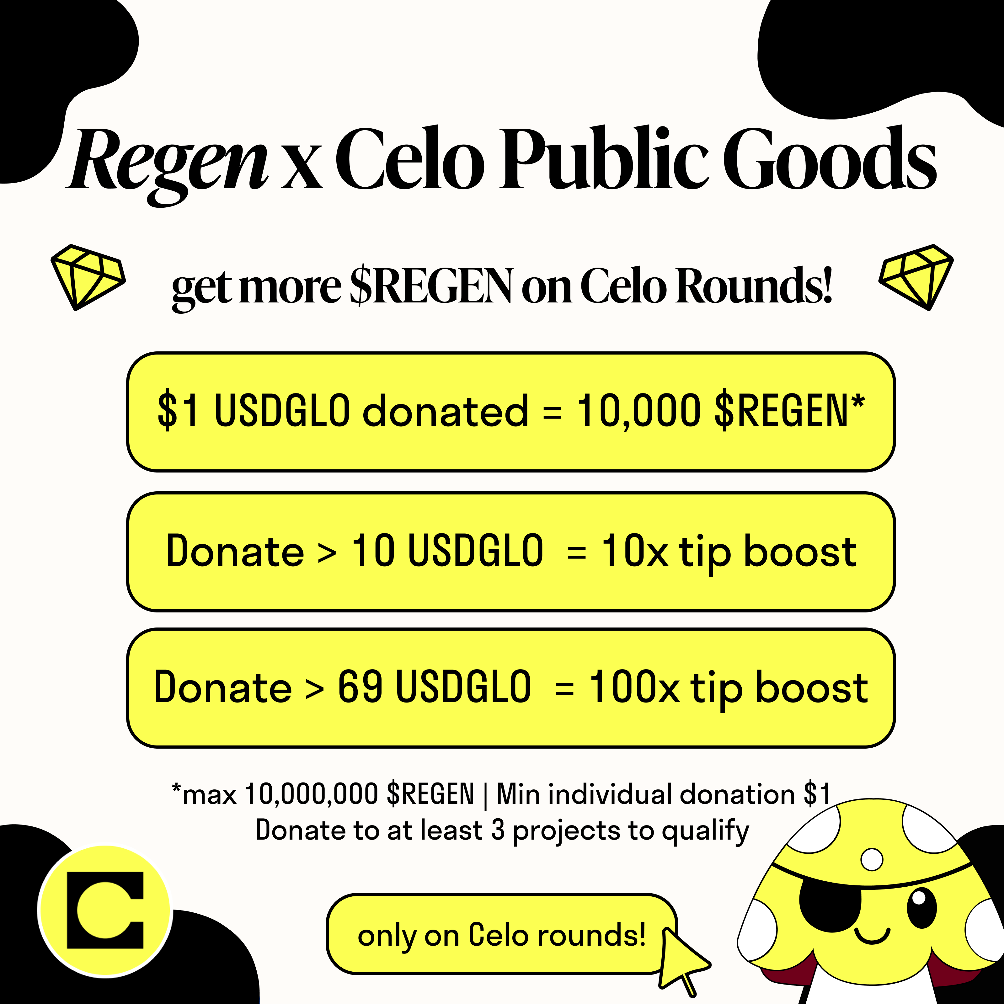 One of the most significant experiments involved Regen Tips. In partnership with Regen Tips, we incentivized participation by offering $REGEN token allocations to contributors, with a tiered rewards system based on donation amounts. For example, every $1 USDGLO donated was rewarded with 10,000 $REGEN, and donations over 10 USDGLO or 69 USDGLO received 10x or 100x tipping boosts, respectively.